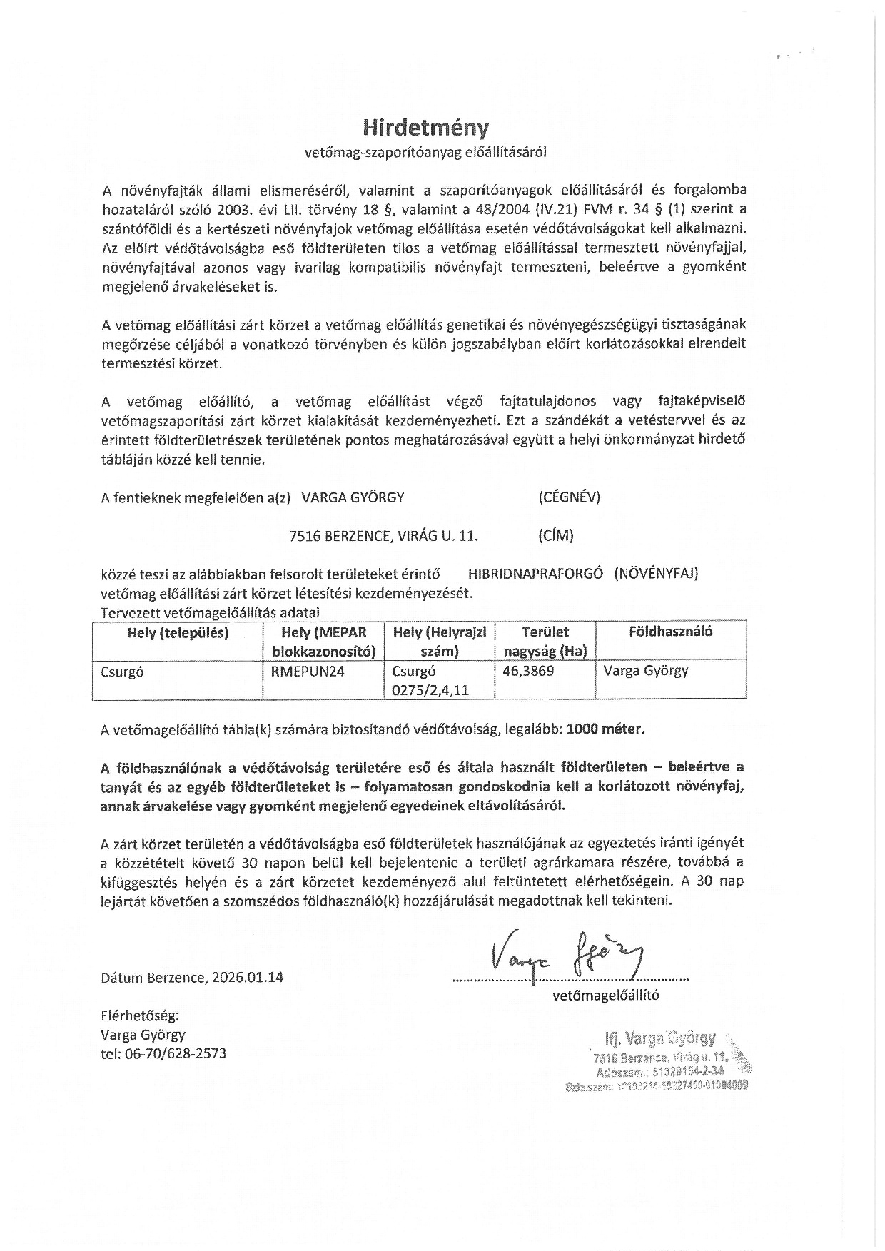 Hirdetmény vetőmag szaporítóanyag előállításáról Kiemelt