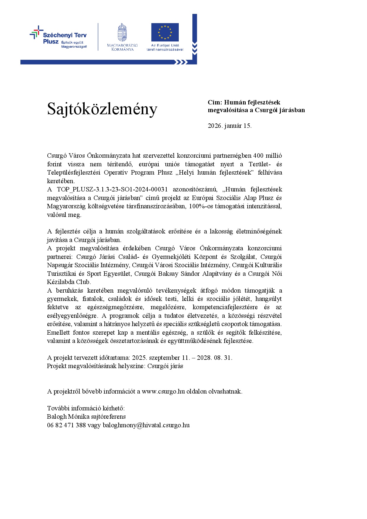 Sajtóközlemény TOP_PLUSZ-3.1.3-23-SO1-2024-00031 Kiemelt