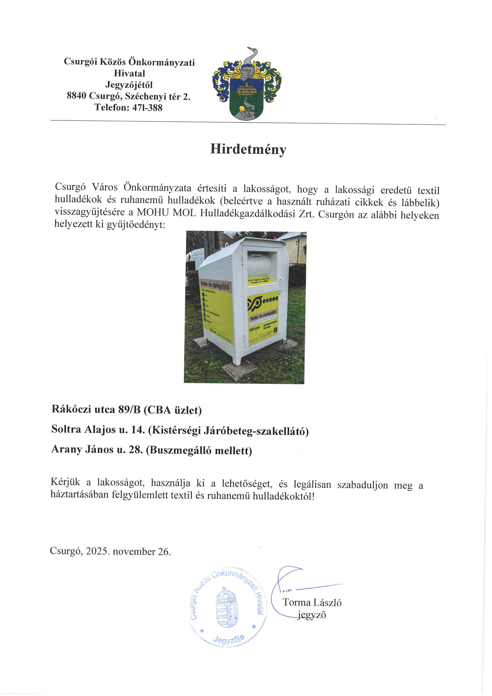 Lakossági hirdetmény textil és ruhanemű gyűjtőedények kihelyezéséről. Kiemelt