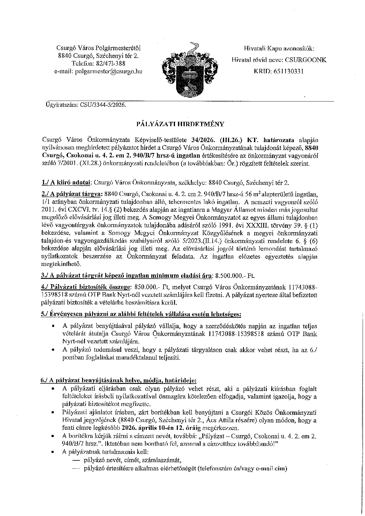 « ELADÁS pályázati hirdetmény Csurgó 989/188 Hrsz. mg. terület bérbeadás