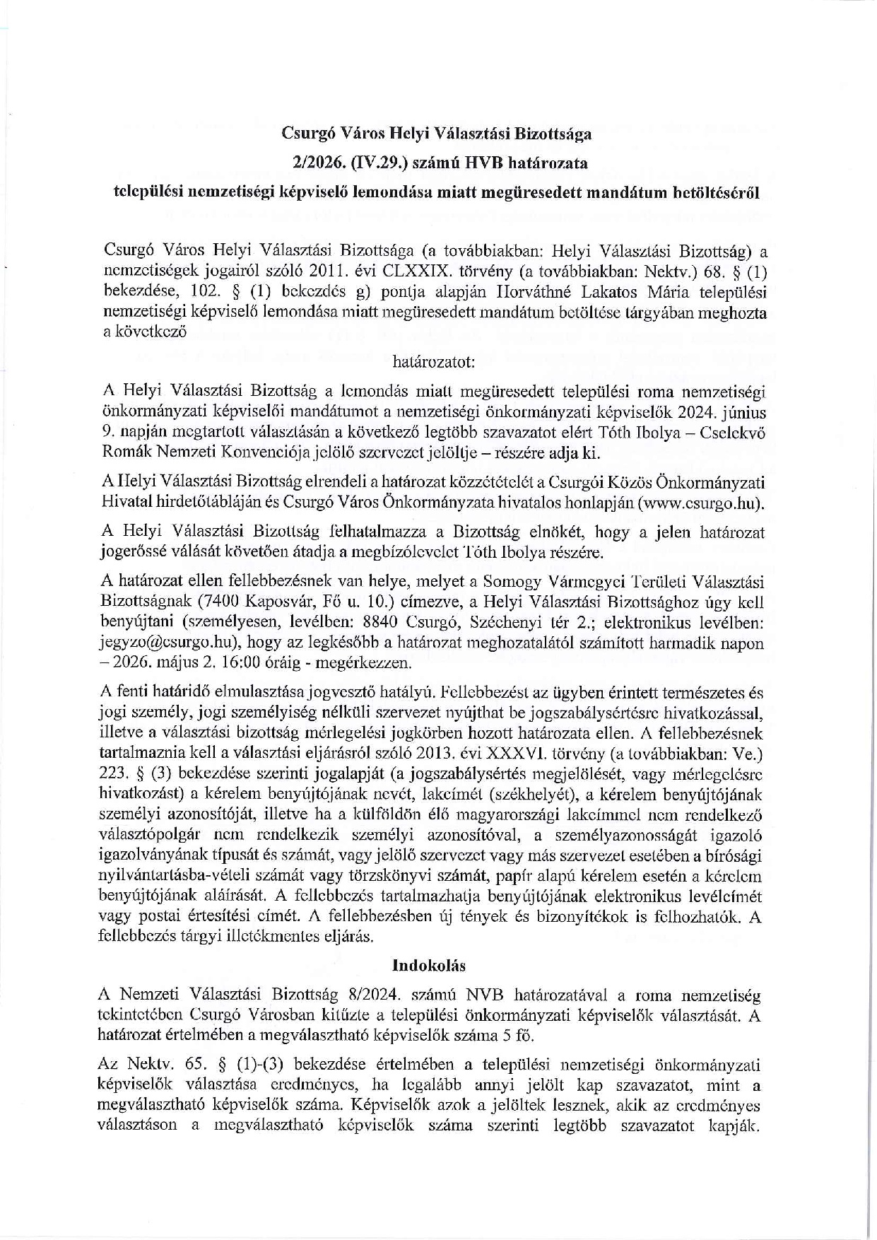 HVB határozat települési nemzetiségi képviselő lemondása miatt megüresedett mendátum betöltéséről Kiemelt
