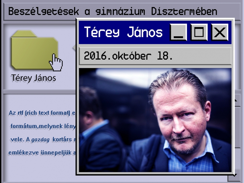 "Irodalmi sorozatunk harmadik évadának első vendége Térey János költő, író, drámaíró, műfordító lesz. Az ünnepélyes megnyitót hagyományosan a Csokonai-padnál tartjuk, majd a "Fehéren feketén" című, Bertalan Johanna és Széll Károly képeiből létrejött fotókiállítás megnyitója következik a lépcsőházban. A program a Díszteremben folytatódik, ahol vendégünket kérdezzük életútjáról, munkáiról, jövőbeni terveiről. Minden érdeklődőt szeretettel várunk 2016. október 18-án, kedden 10 órától a Református Gimnáziumban!