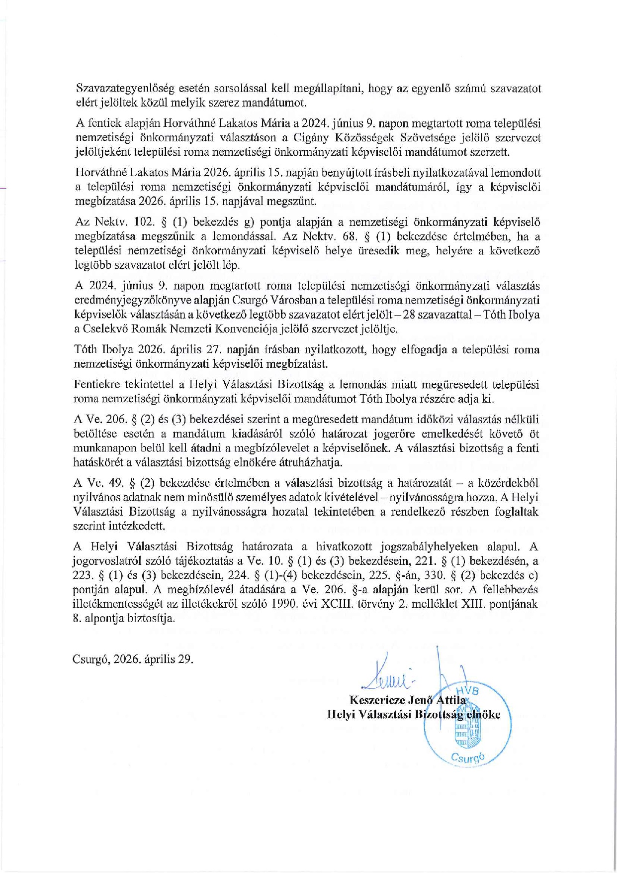 HVB határozat települési nemzetiségi képviselő lemondása miatt megüresedett mendátum betöltéséről Kiemelt