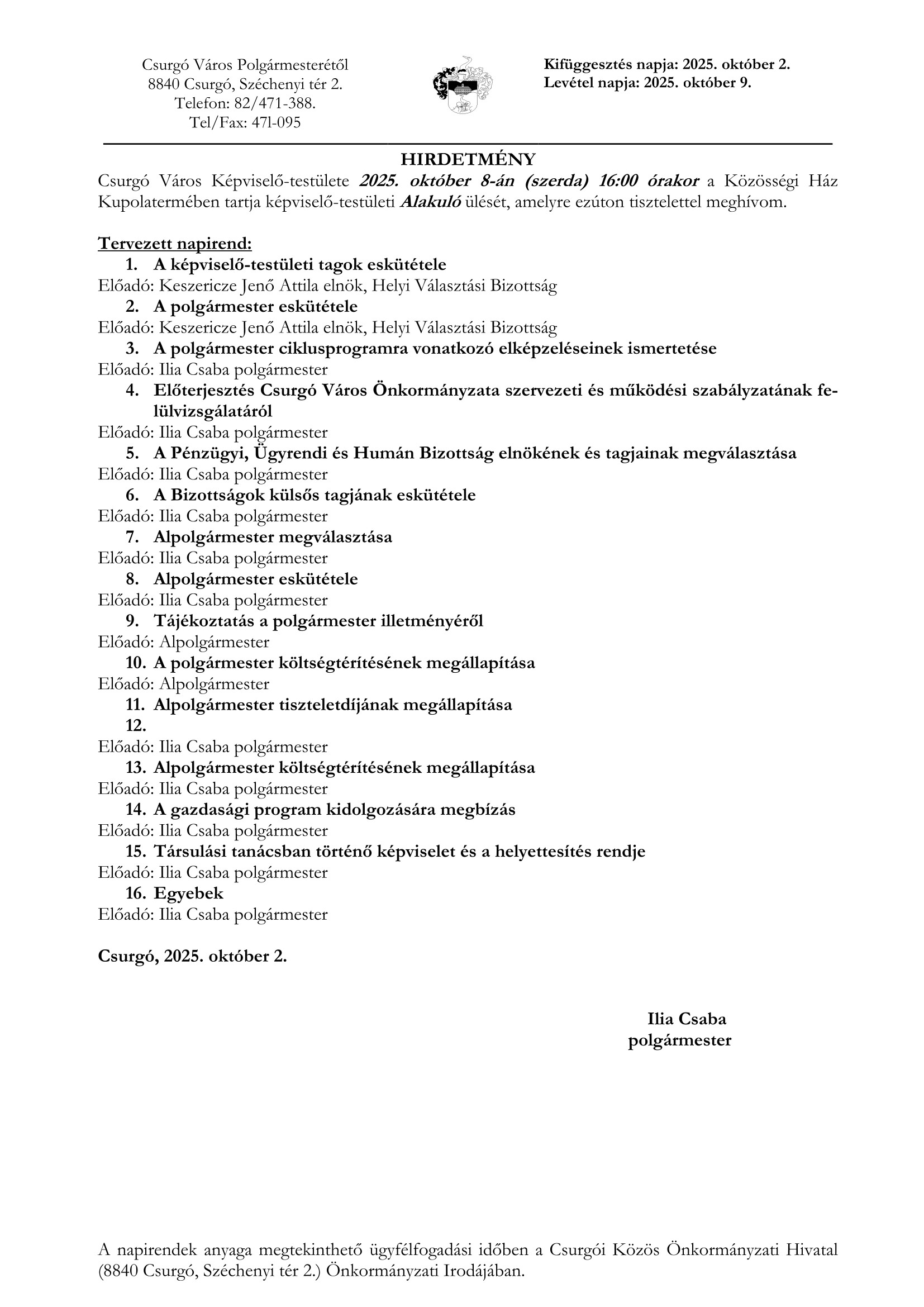 Hirdetmény képviselőtestület alakuló ülés Kiemelt